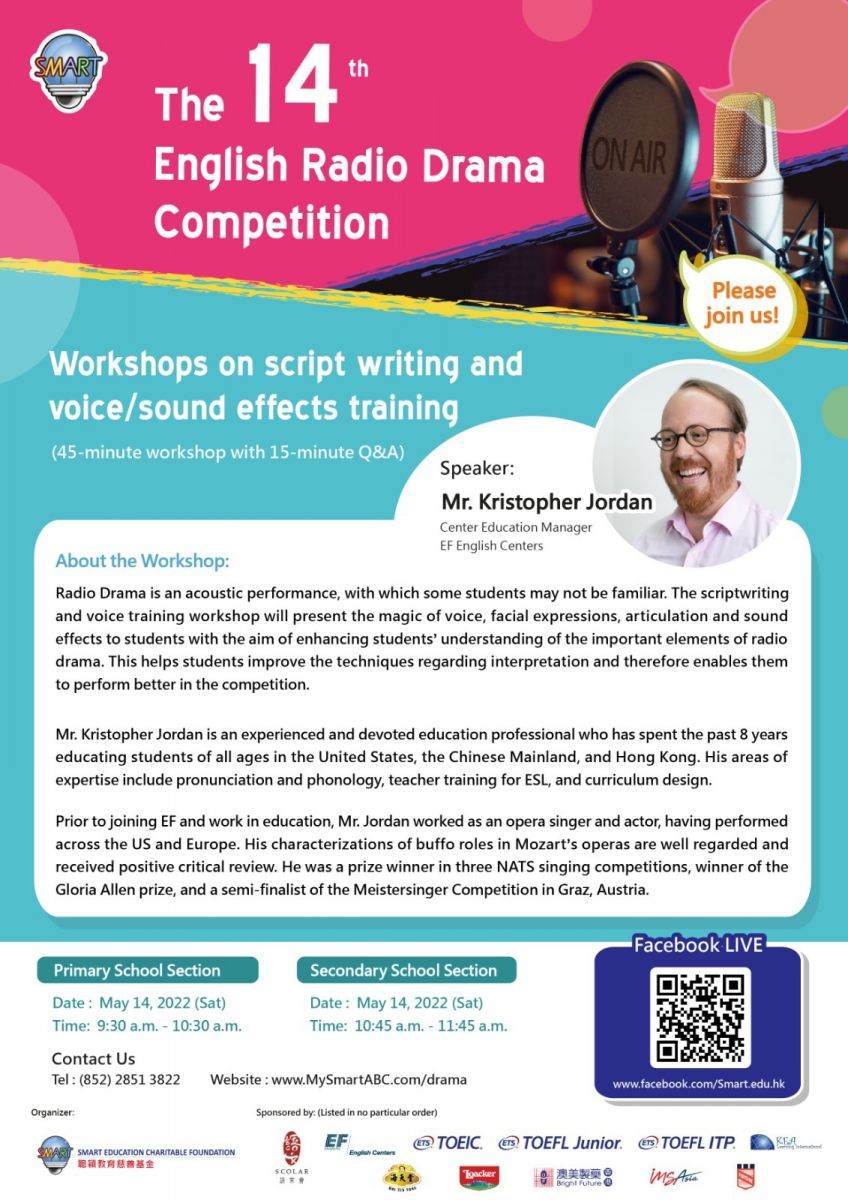 In order to help students master the techniques regarding script writing and production of radio drama more effectively, Smart Education Charitable Foundation is honoured to invite Mr. Kristopher Jordan, Center Education Manager in EF English Centers to host the workshop.